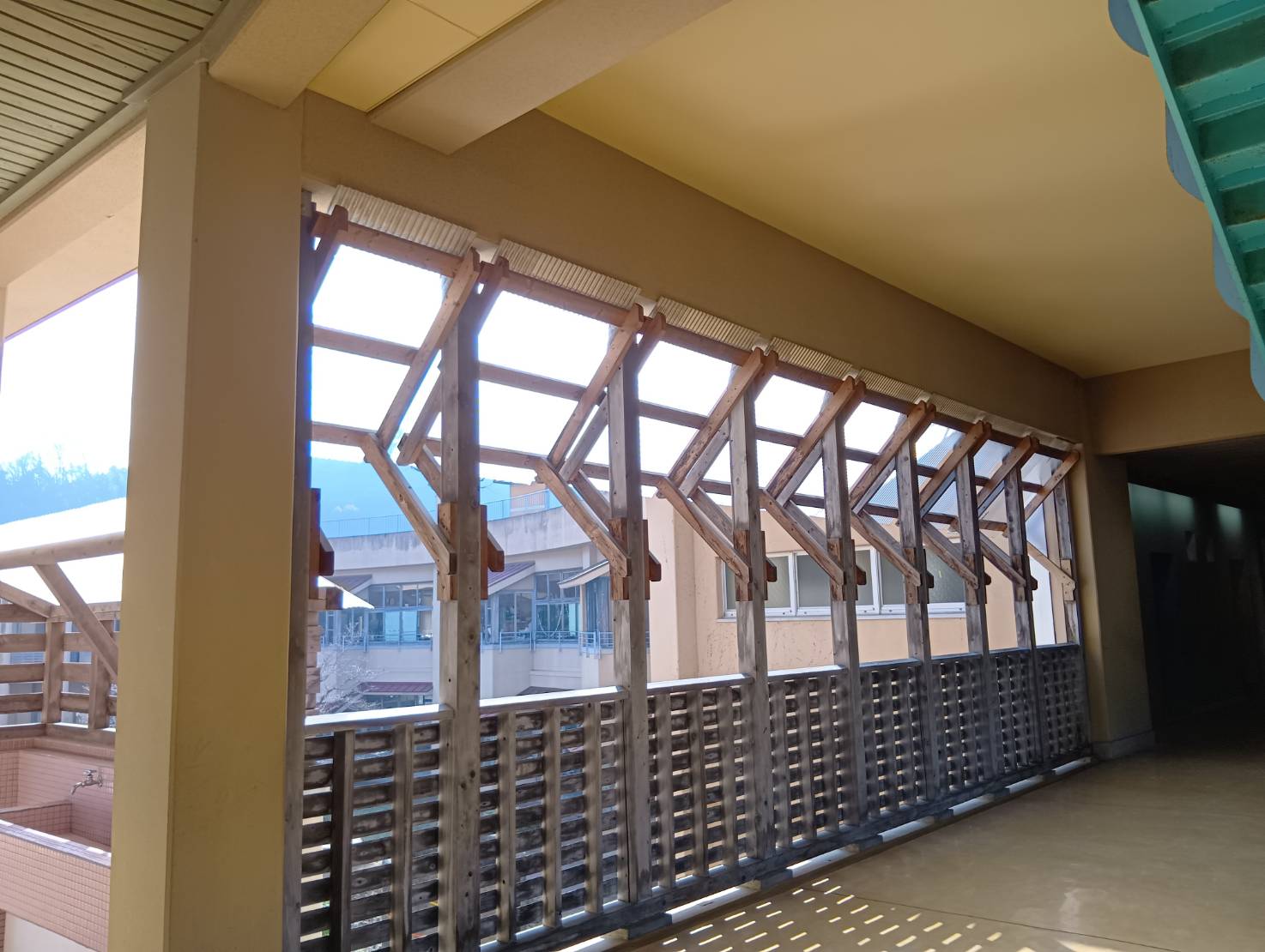 外廊下の手すりも木製
