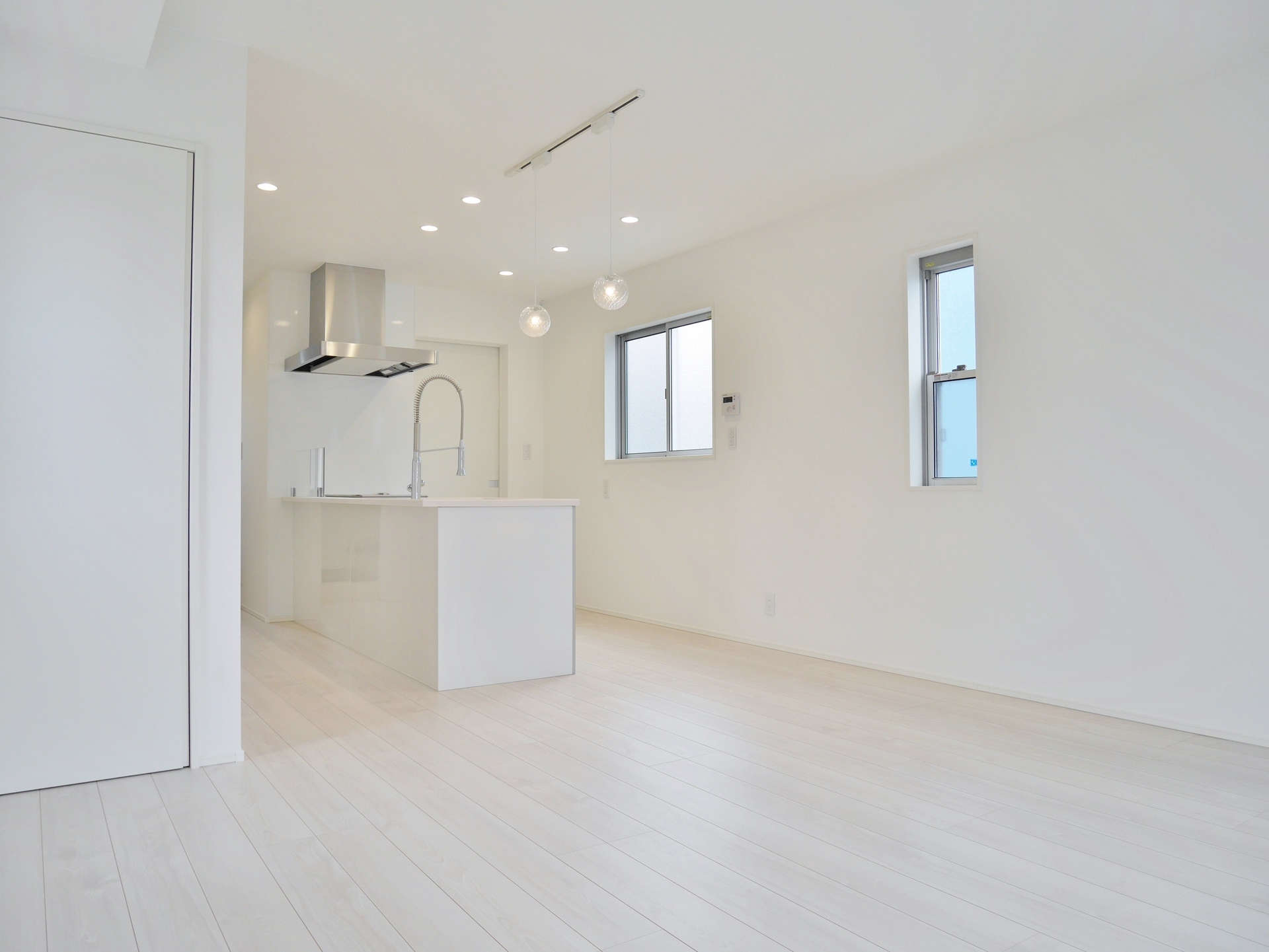 ホワイトで統一されたリビングは光が反射して明るく